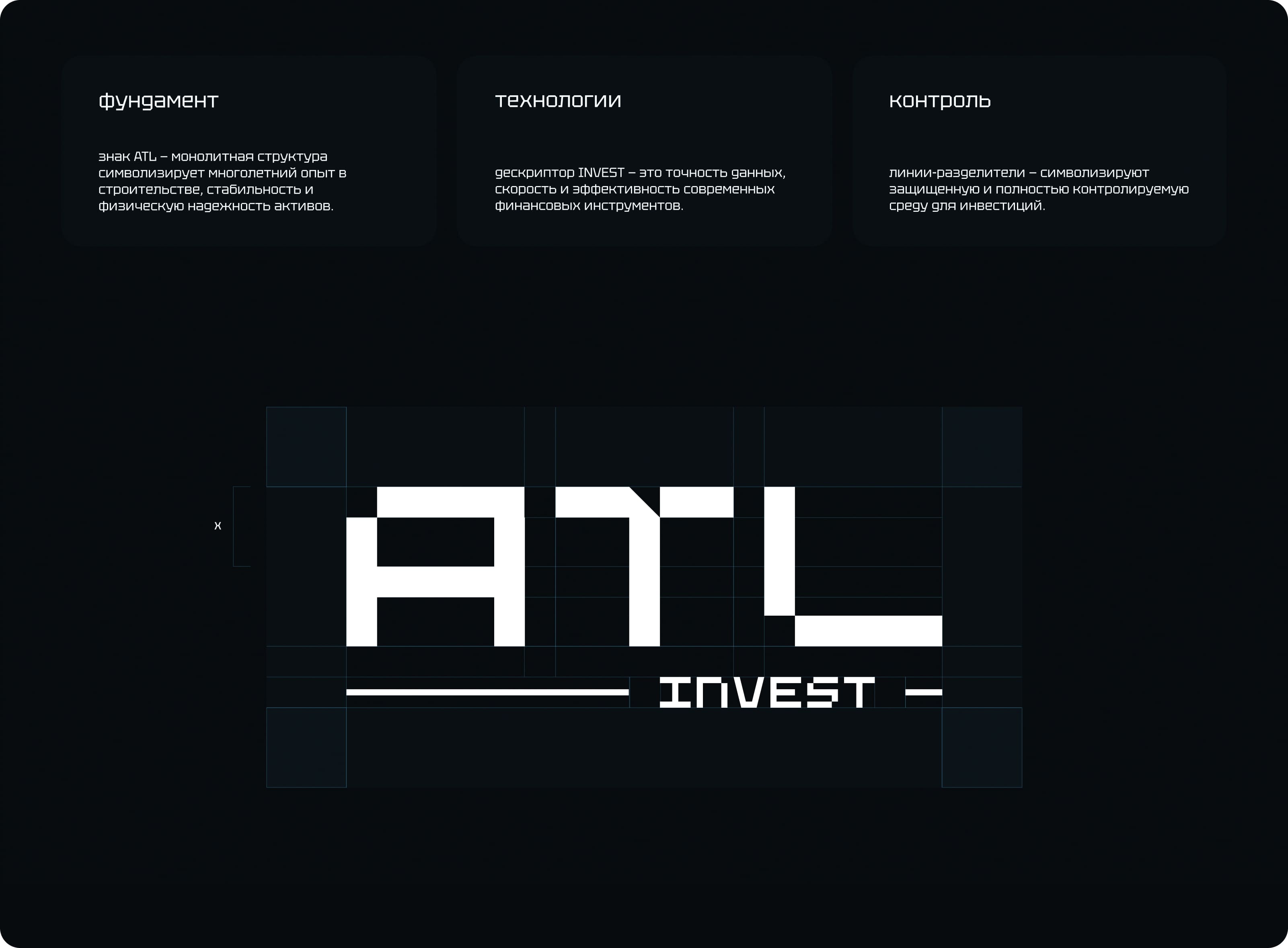 Знак «ATL» символизирует фундамент, опыт и надёжность. Его монолитная, тяжёлая, блоковая форма выражает концепцию «архитектуры», стабильности и основательности.