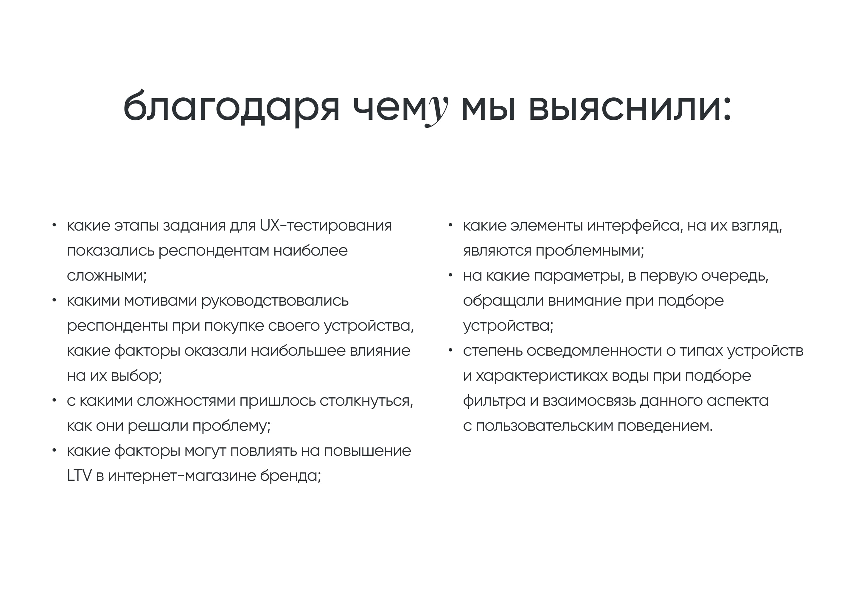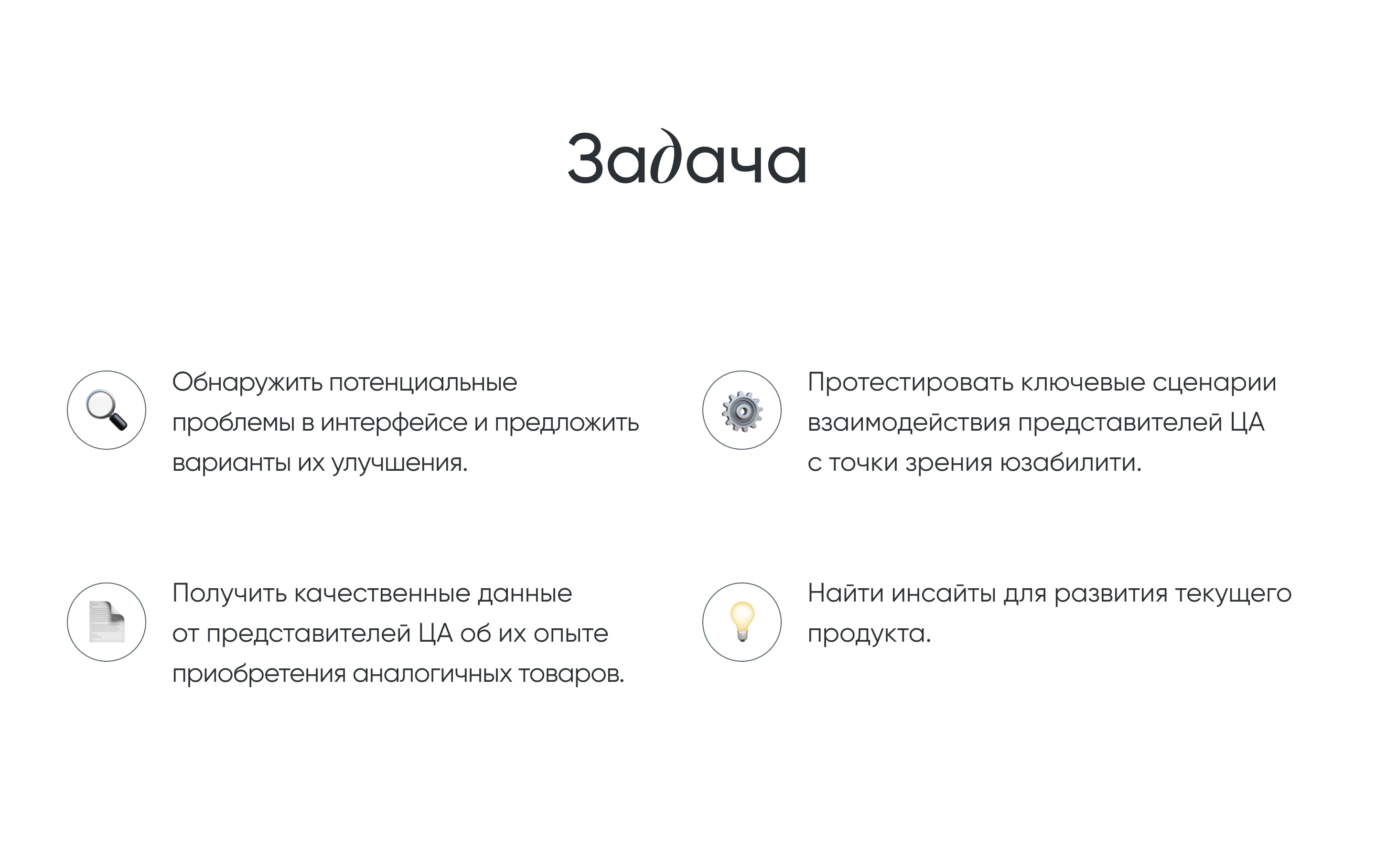 Обнаружить потенциальные проблемы в интерфейсе и предложить варианты их улучшения. Протестировать ключевые сценарии взаимодействия, получить качественные данные от представителей ЦА об их опыте приобретения аналогичных товаров.