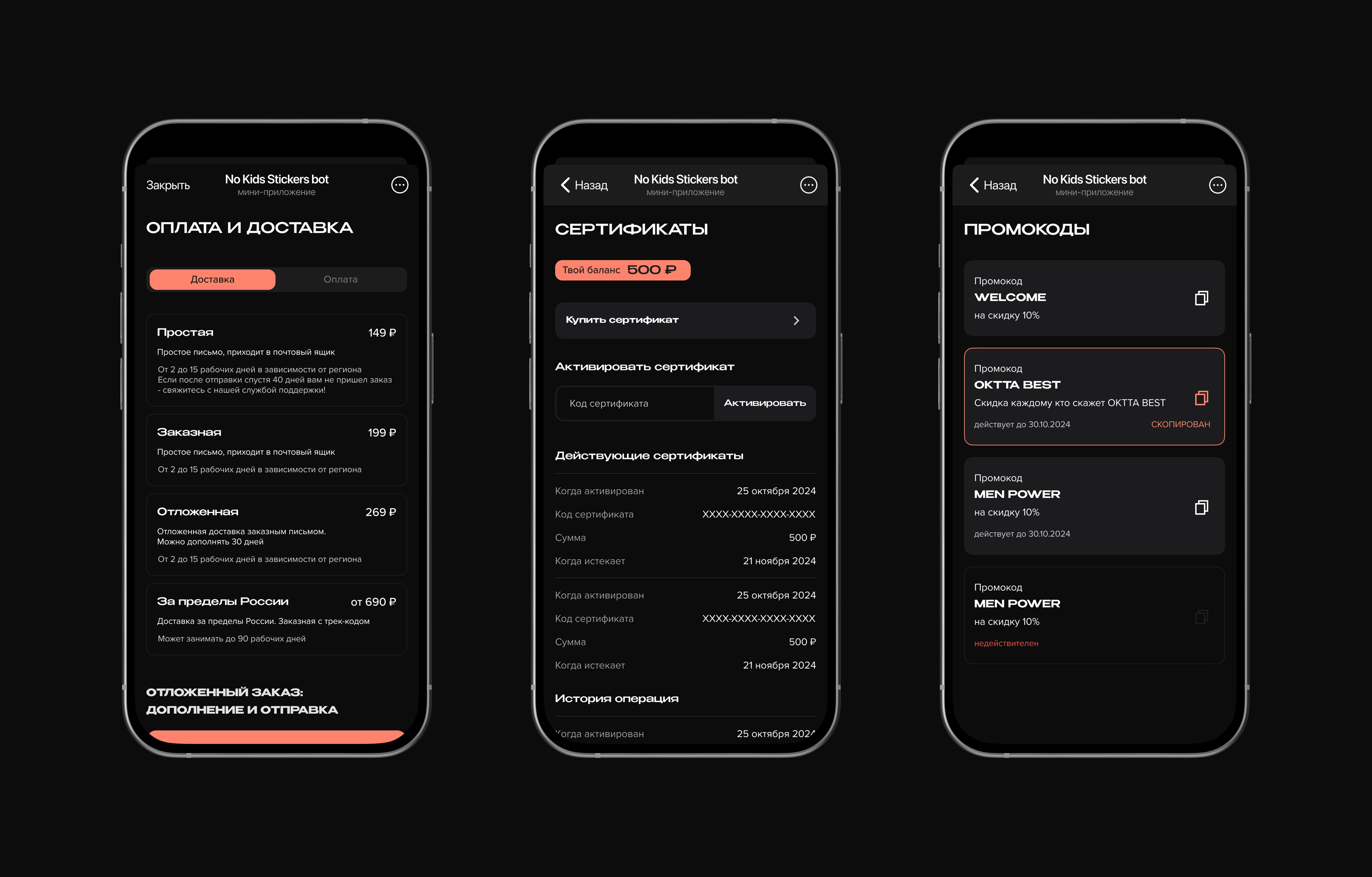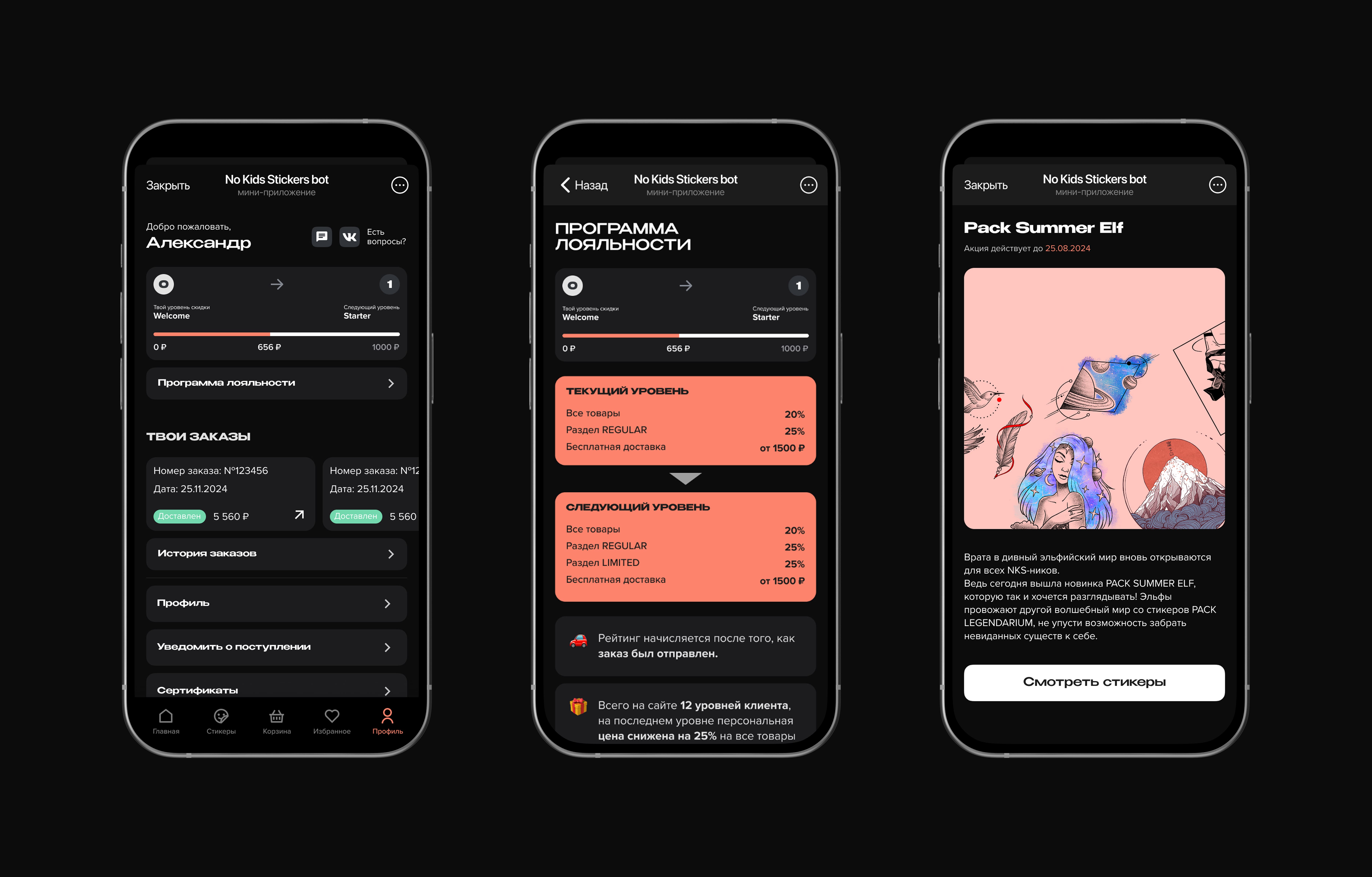 История заказов, уровень пользователя, баллы, сертификаты, скидки, уведомления и промокоды — всё наглядно, удобно и с возможностью гибко управлять.