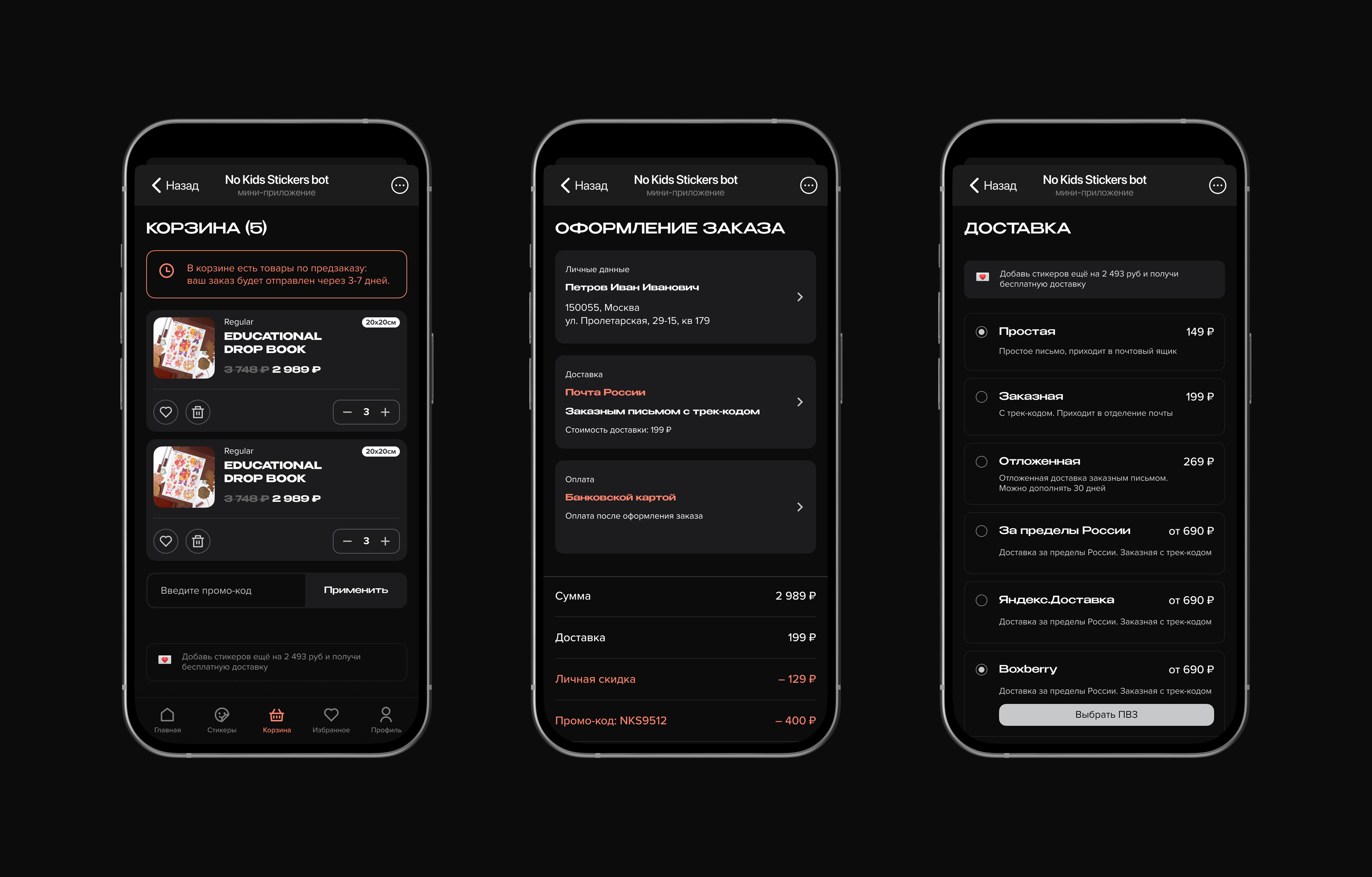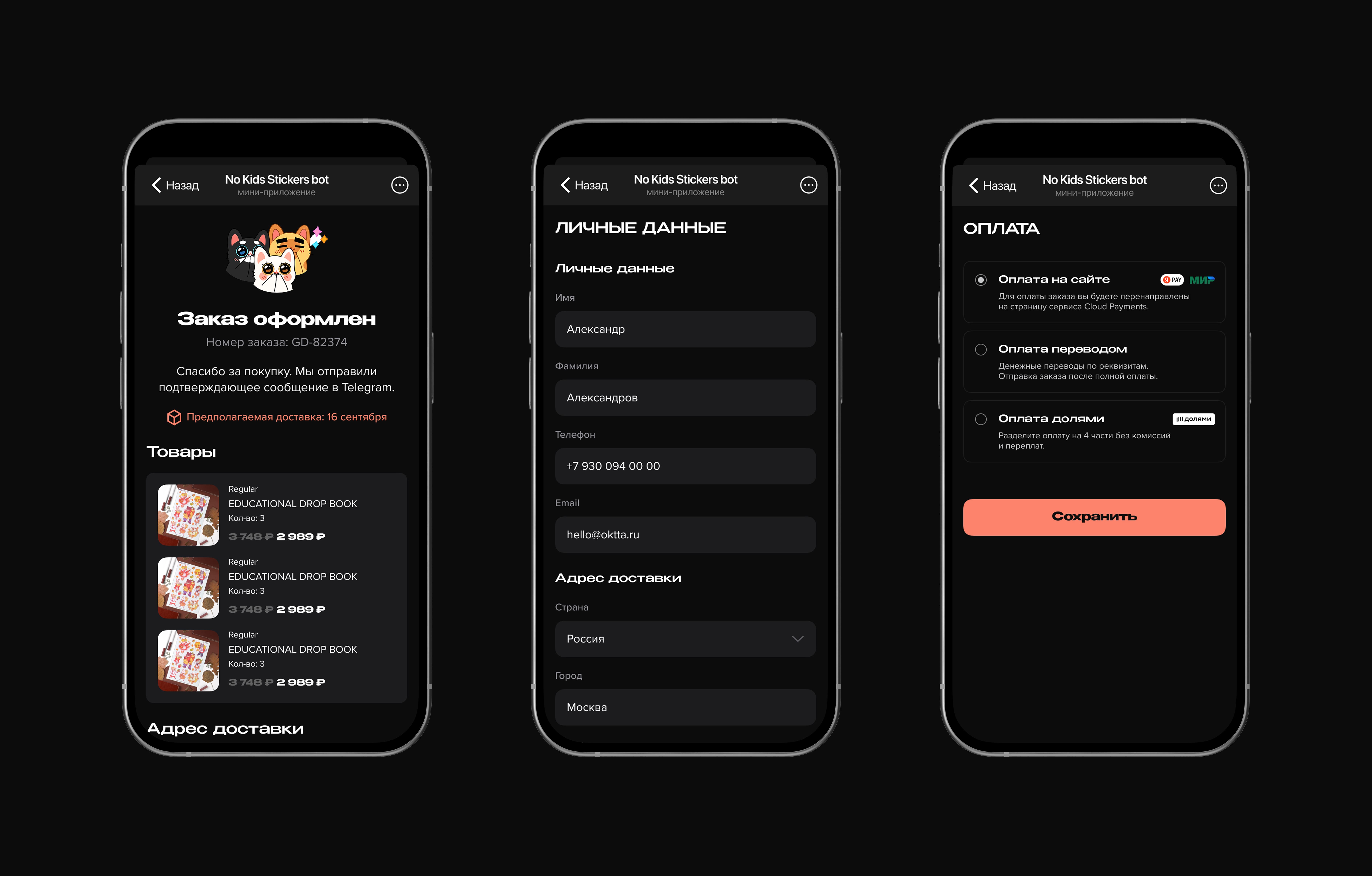 Настроили удобный чекаут с персональными скидками, промокодами, управляемой доставкой и оплатой частями. Предусмотрены статусы, отложенные заказы, уведомления о сроках отправки.
