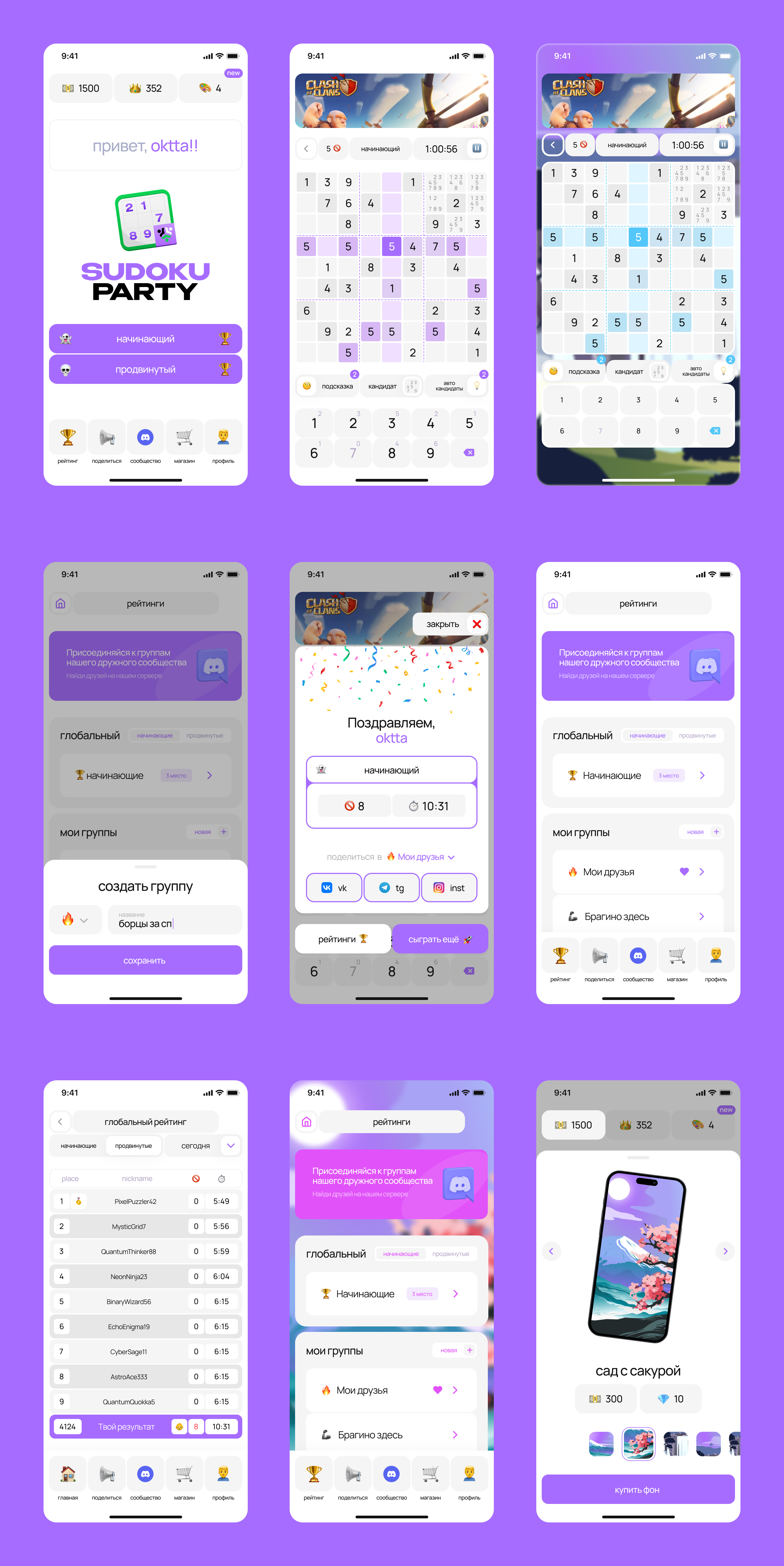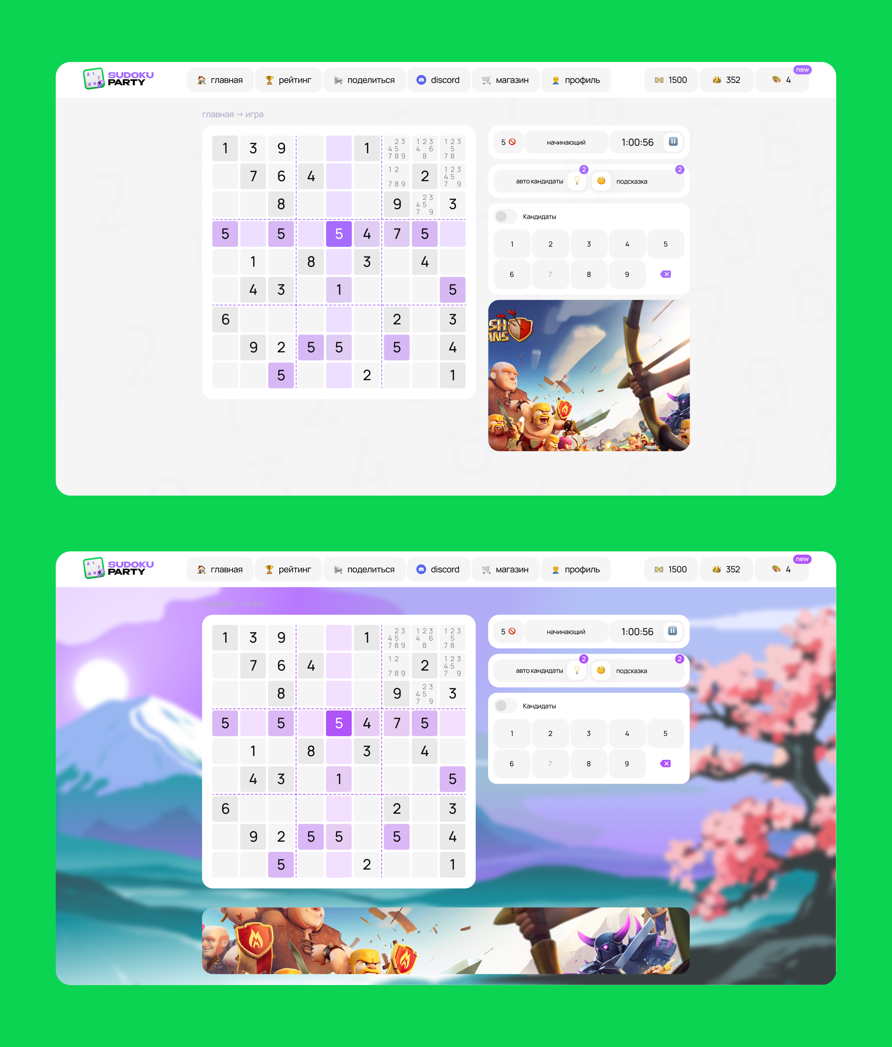 Помимо дизайна игры судоку, мы разработали яркий и запоминающийся брендинг. Выбрали смелую и динамичную цветовую гамму, которая не только привлекает внимание, но и отражают настроение и энергичную атмосферу игры.