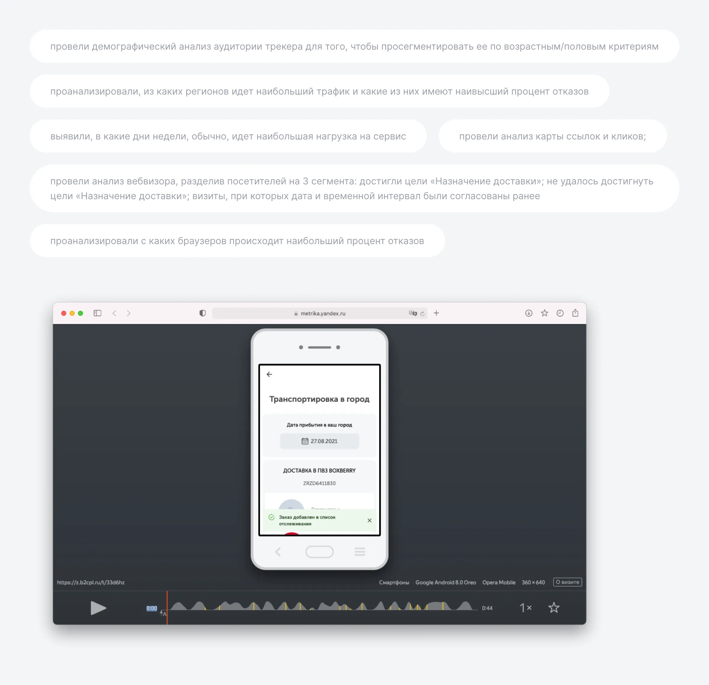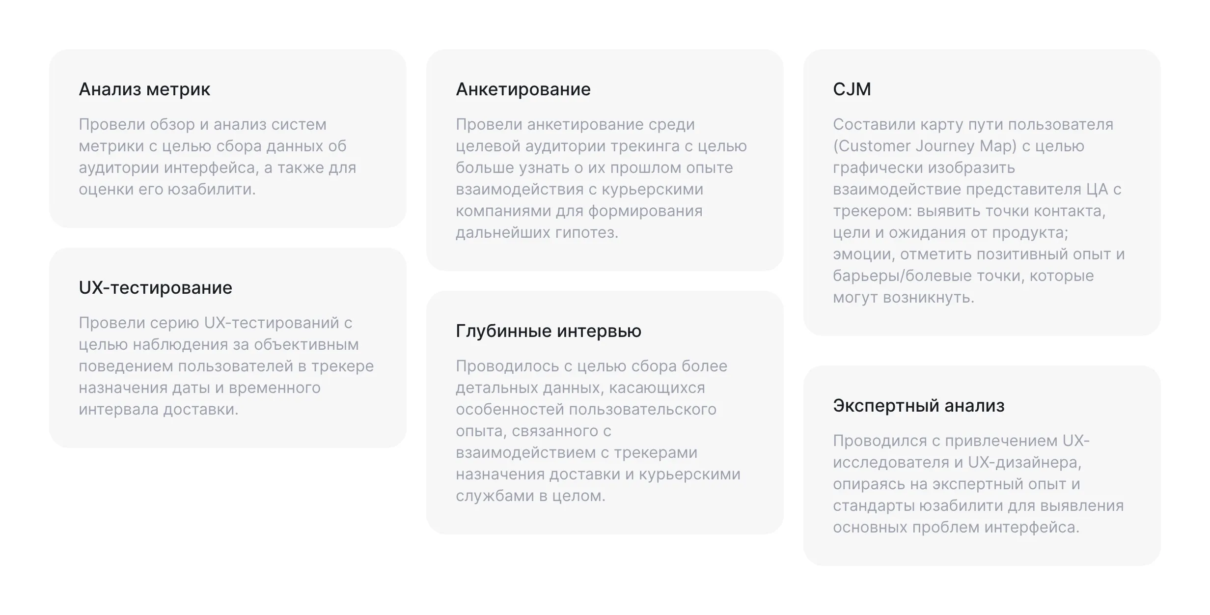 Провели серию UX-тестирований на сайте для того, чтобы выяснить, какие барьеры встают перед респондентами на пути назначения даты доставки и с какими возможными трудностями они сталкиваются. Задание для теста было построено таким образом, чтобы всеобъемлюще охватить варианты сценариев, с которыми встречаются пользователи при взаимодействии с трекером. На начальном этапе респондентам давался ряд скрининговых вопросов для того, чтобы подтвердить опыт пользователей и быть уверенными в их релевантности. В результате проведения тестов, были обнаружены некоторые сложности, для которых в дальнейшем были предложены варианты решений.
