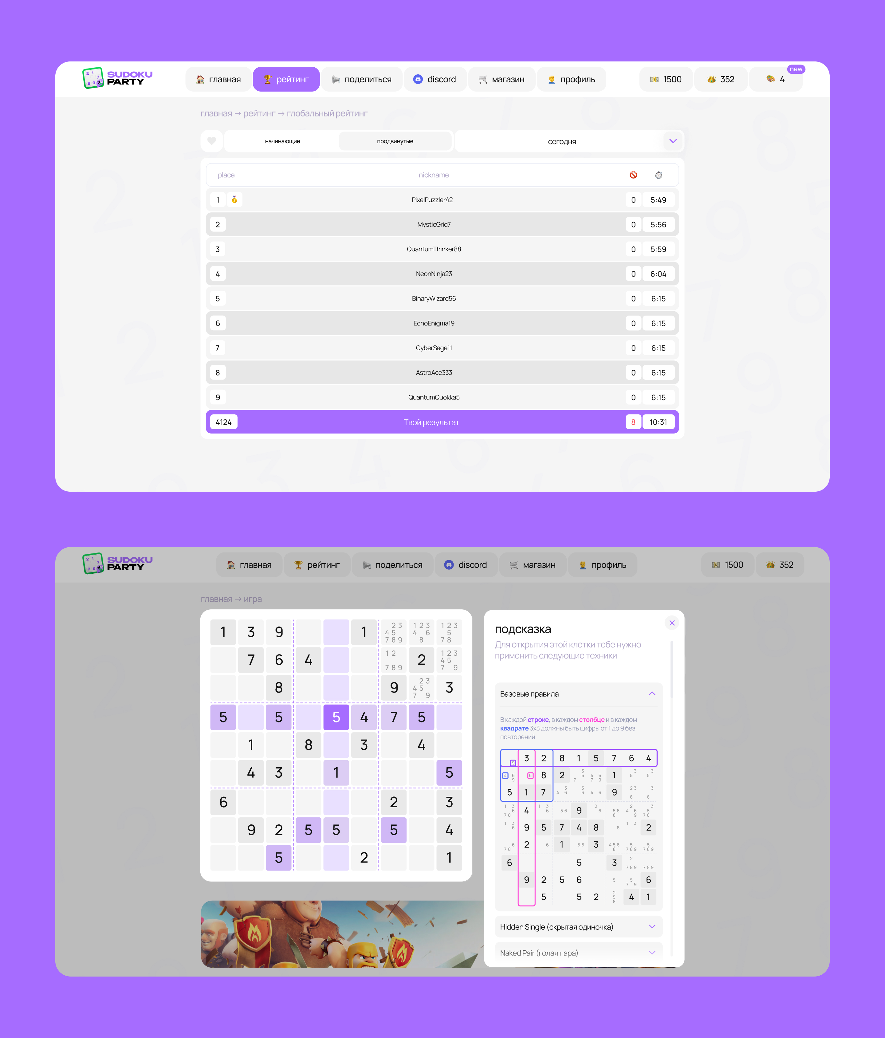 Помимо дизайна игры судоку, мы разработали яркий и запоминающийся брендинг. Выбрали смелую и динамичную цветовую гамму, которая не только привлекает внимание, но и отражают настроение и энергичную атмосферу игры.